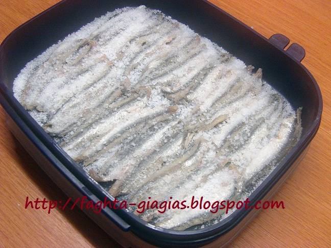 | Αφού τα φιλετάρουμε, τα ξαναπλένουμε και τα βάζουμε σε σουρωτήρι, να στραγγίξουν καλά. Όταν στραγγίξουν, βάζουμε σε ένα σουρωτήρι μία στρώση αλάτι χοντρό και πάνω του, απλώνουμε τους γαύρους με την κοιλιά προς τα κάτω. Φροντίζουμε τα ψάρια να είναι τοποθετημένα το ένα δίπλα στο άλλο, χωρίς να αφήνουν κενά μεταξύ τους, και το αλάτι να τα σκεπάζει και να καλύπτει τις τυχόν τρύπες. Συνεχίζουμε έτσι, μέχρι να τελειώσουν όλα τα ψάρια και να καλυφθούν καλά με αλάτι. Όταν τελειώσουμε, τοποθετούμε το σουρωτήρι σε ένα μπολ, στο οποίο έχουνε βάλει ένα πιάτο γυρισμένο ανάποδα και το διατηρούμε σε δροσερό μέρος, (ή στο ψυγείο, αν έχει πολύ ζέστη), προστατευμένο από μύγες και άλλα έντομα. | |